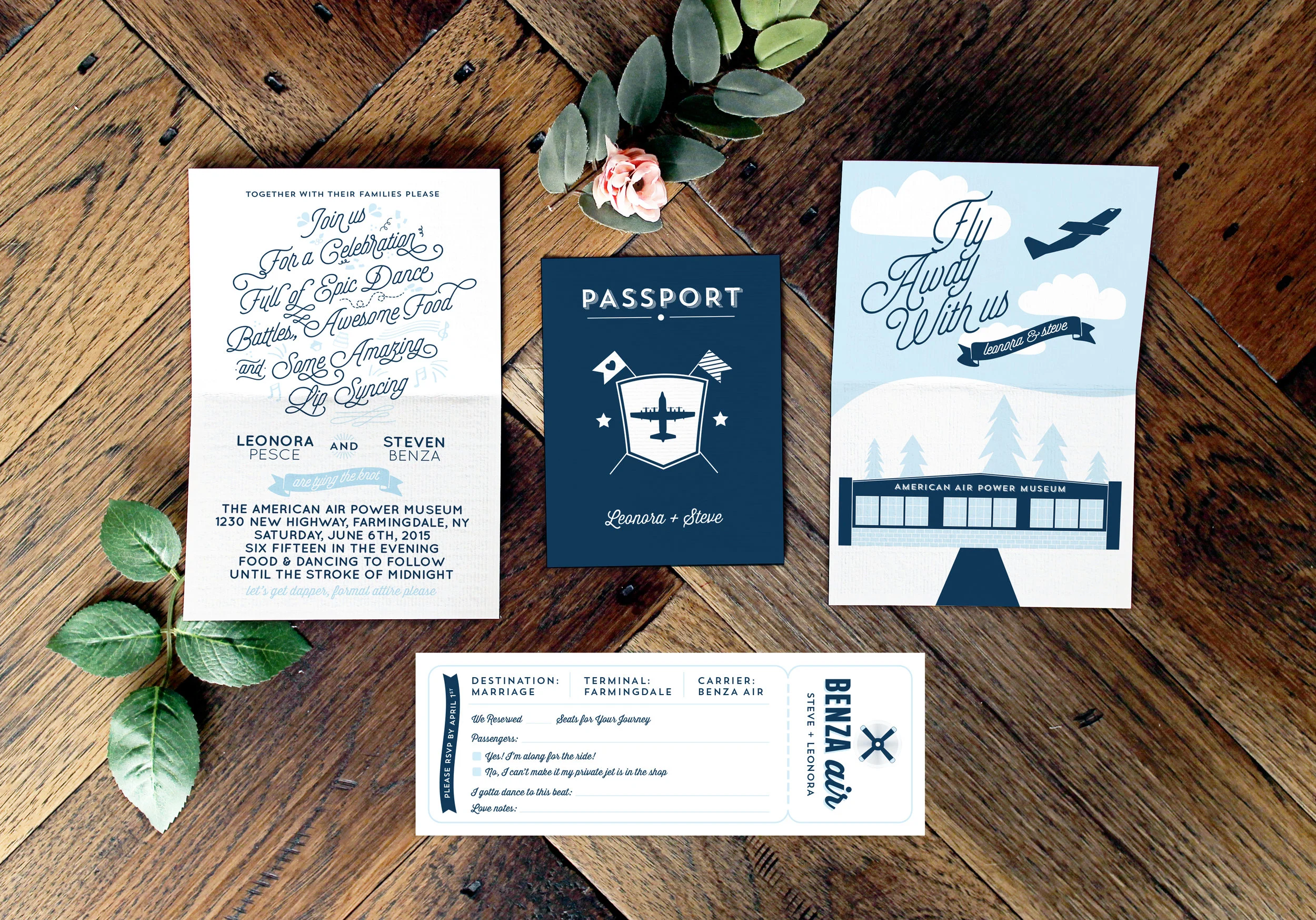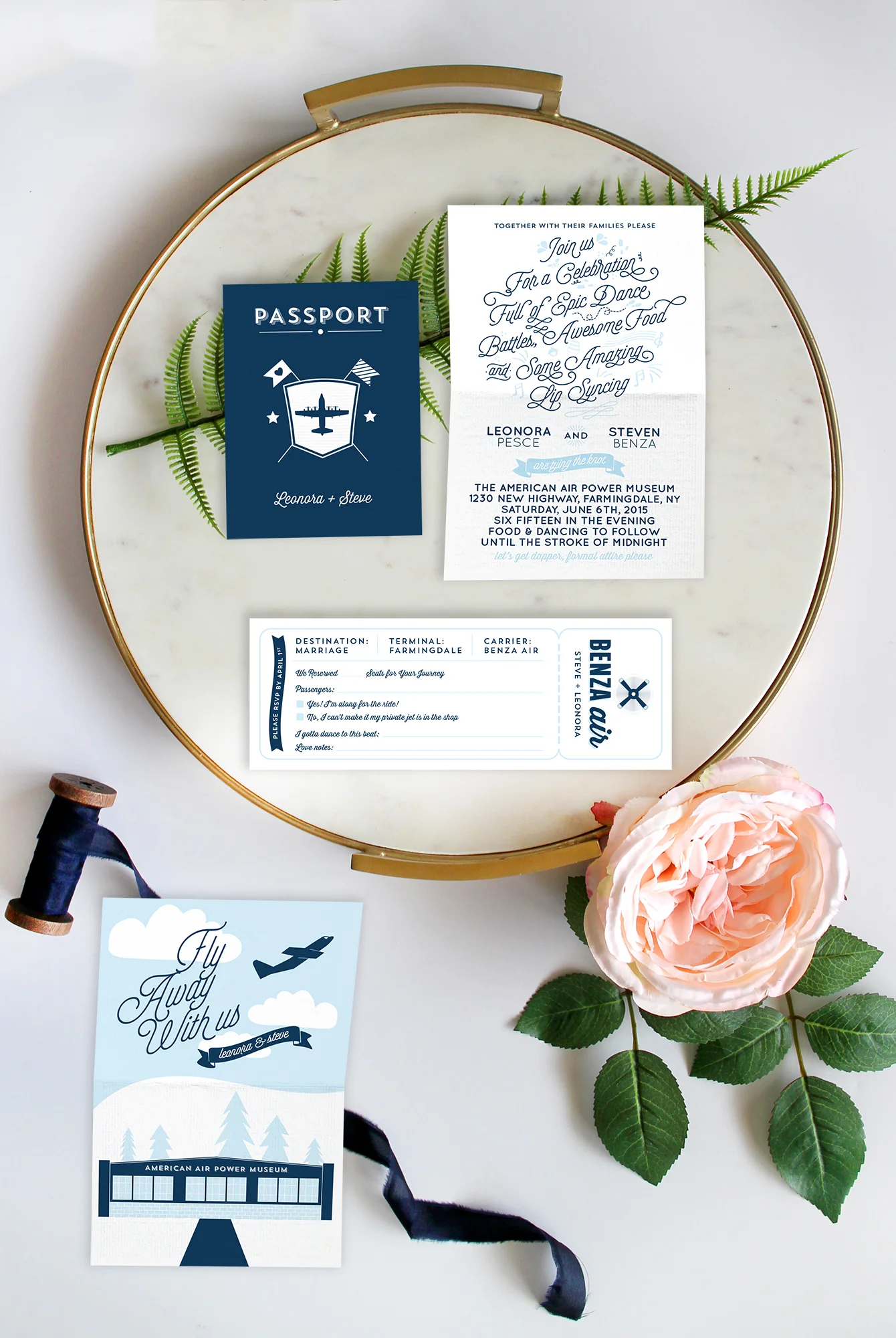 These navy blue custom made passport wedding invitations really set the tone for your event. The inside of the book has all the wedding details as well as a an illustration of your venue! The RSVP boarding pass completes this suite. These passport invitations are perfect for a destination wedding, a travel themed wedding or if the bride and groom are known globe trotters! Passport invites can also be re-designed for a bridal shower, baby shower, birthday party or sweet 16! Colors are customizable as well.